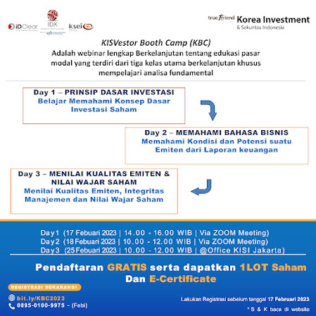 Nah kalo temen-temen mau belajar analisa fundamental lengkap dari nol sampe bisa baca laporan keuangan dan menilai harga wajar saham. Di event ini kita akan belajar bareng analisa fundamental lengkap dan gratis pula. Jadi selama 3 kali pertemuan kita akan mebahas step-by-step analisa fundamental saham. Mulai dari mempelajari prinsip dasar investasi di hari pertama di tanggal 17 Februari 2023. Lalu Di hari kedua kita belajar memahami bisnis dengan membaca laporan keuangan di tanggal 18 Februari 2023. Dan di hari terakhir minggu depannya di tanggal 25 Februari kita akan belajar bareng. Temen-temen boleh dateng secara langsung ke kantor KISI Kelapa Gading biar lebih enak belajarnya. Kalo mau nonton online juga tetap bisa lewat zoom. Di hari terakhir kita akan belajar cara menilai kualitas emiten dan juga menilai harga wajar saham. Teman-teman bisa ikut event ini: bisa langsung daftar dengan klik gambar berikut ya:
